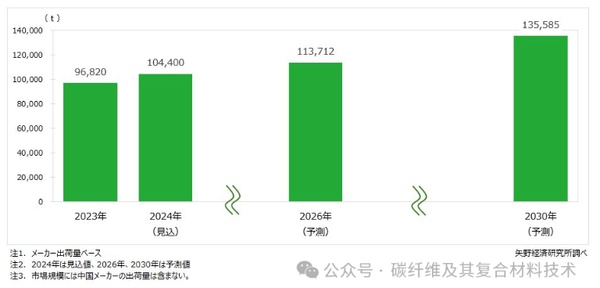 据报告预测,2024年全球PAN基碳纤维(以日本、韩国、美国、欧洲以及中国台湾地区,即中国大陆地区以外的碳纤维制造商出货量为基础数据)的出货量预计将达到10.44万吨,与2023年同期的9.68万吨相比,增长了7.8%。